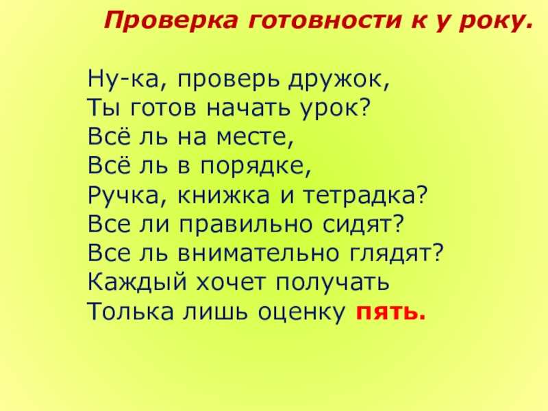 Проверка готовности к у року.Ну-ка, проверь дружок, Ты готов начать урок? Всё ль на месте, Всё ль в порядке, Ручка, книжка и тетрадка? Все ли правильно сидят? Все ль внимательно глядят? Каждый хочет получать