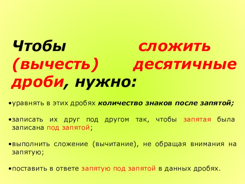 Слайд 9Чтобы сложить (вычесть) десятичные дроби, нужно: