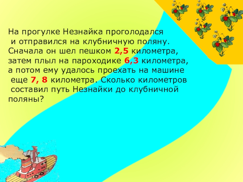 На прогулке Незнайка проголодался и отправился на клубничную поляну. Сначала он шел пешком 2,5 километра, затем плыл