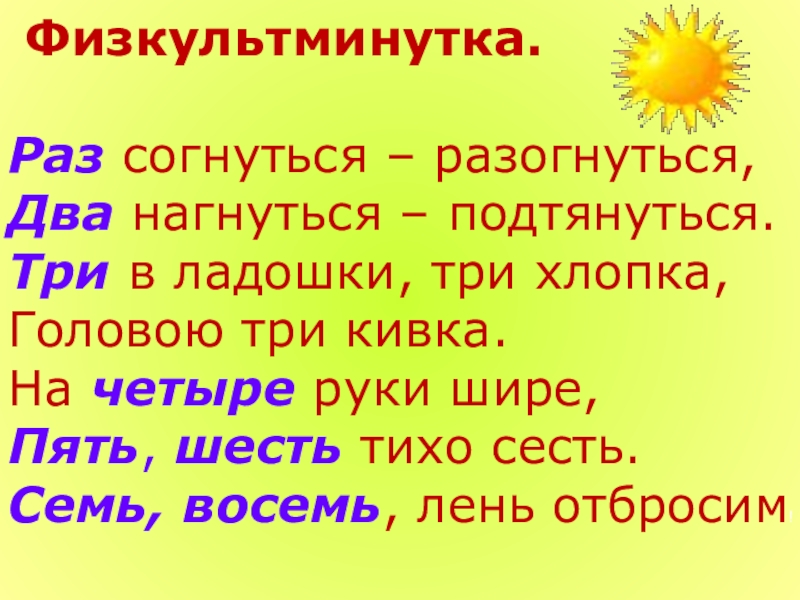 Физкультминутка. Раз согнуться – разогнуться, Два нагнуться – подтянуться.  Три в ладошки, три хлопка, Головою