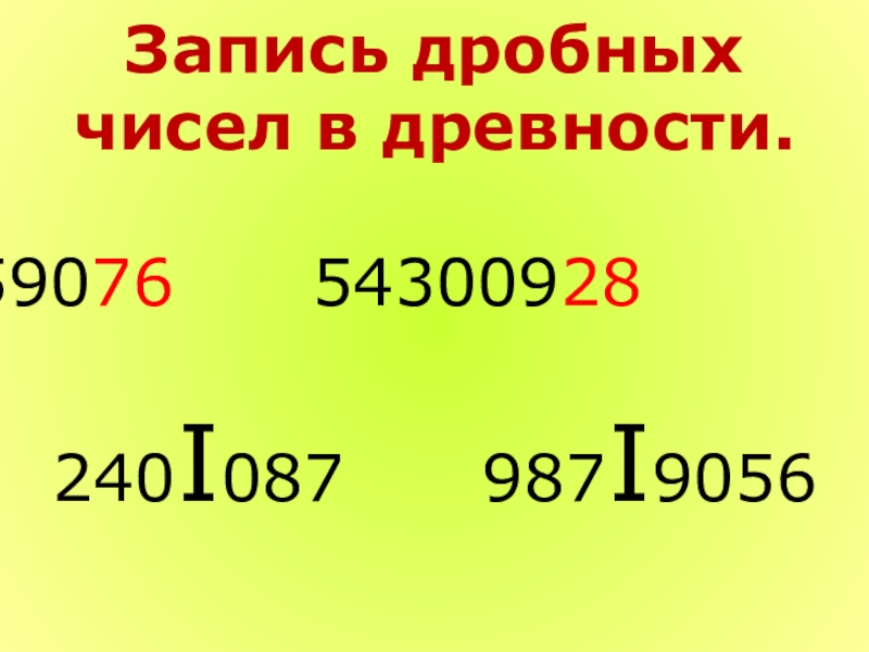 Запись дробных чисел в древности.9076   54300928240Ι087   987Ι9056