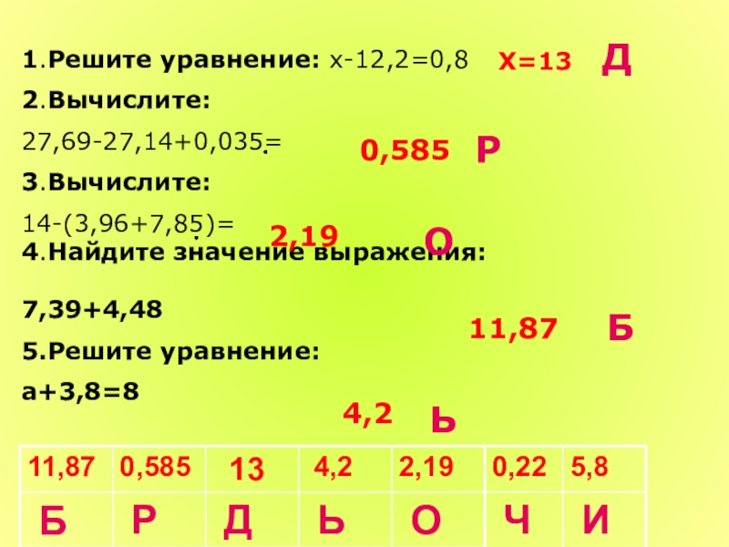 1.Решите уравнение: х-12,2=0,8 2.Вычислите:27,69-27,14+0,035=3.Вычислите:14-(3,96+7,85)=4.Найдите значение выражения:7,39+4,485.Решите уравнение:а+3,8=8Х=13Д0,585Р2,19БО11,874,2Ь