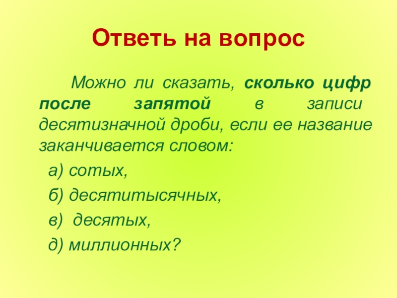 Ответь на вопрос   Можно ли сказать, сколько цифр после запятой в записи десятизначной дроби, если