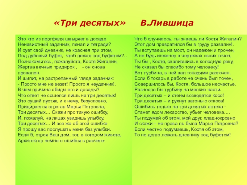 ль на месте, Всё ль в порядке, Ручка, книжка и тетрадка? Все ли правильно сидят? Все ль внимательно глядят? Каждый хочет получать Толька лишь оценку пять.