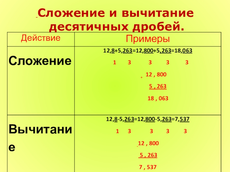 Презентация, доклад к уроку математики на темуСложение и вычитание десятичных дробей