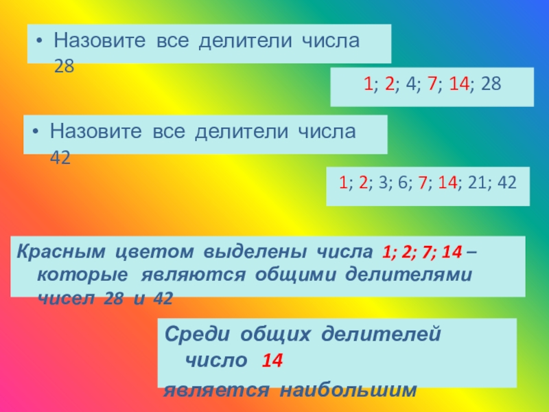 Красным цветом выделены числа 1; 2; 7; 14 – которые являются общими делителями чисел 28 и 42