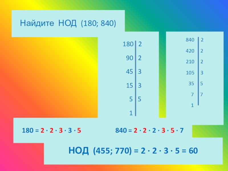 180 = 2 ∙ 2 ∙ 3 ∙ 3 ∙ 5 840 = 2 ∙ 2 ∙ 2 ∙ 3 ∙ 5 ∙ 7