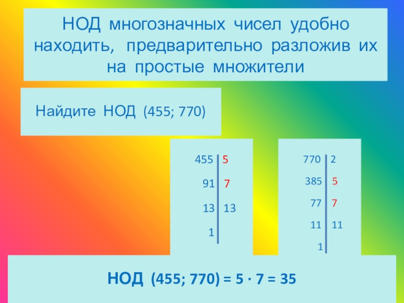 НОД (455; 770) = 2 ∙ 2 ∙ 3 ∙ 5 = 60