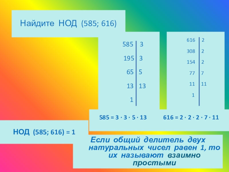 585 = 3 ∙ 3 ∙ 5 ∙ 13 616 = 2 ∙ 2 ∙ 2 ∙ 7 ∙ 11