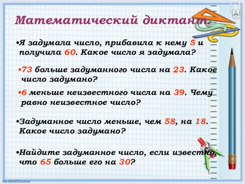 Найдите задуманное число, если известно, что 65 больше его на 30?