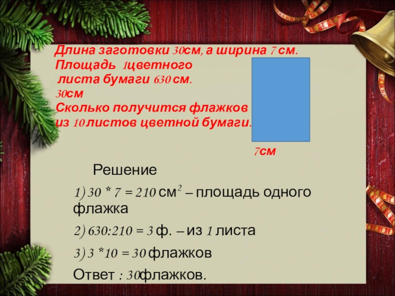 1) 30 * 7 = 210 см2 – площадь одного флажка