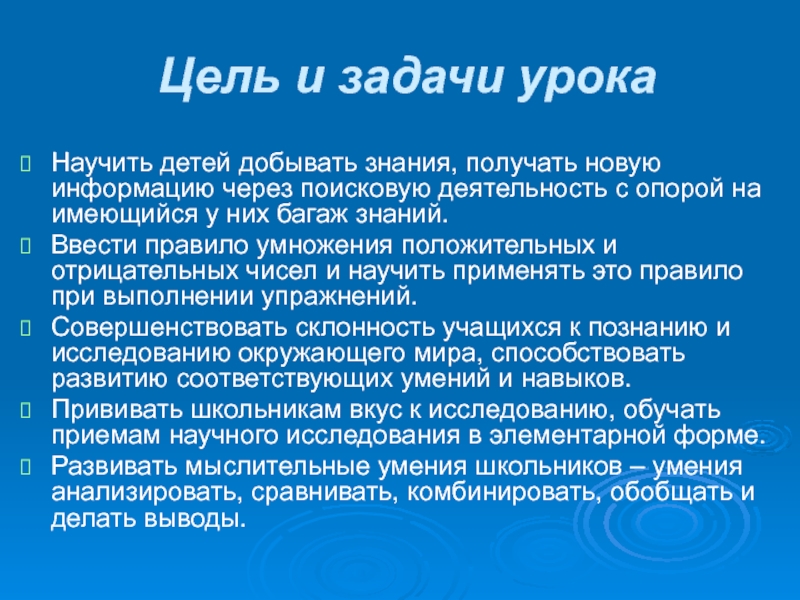 Ввести правило умножения положительных и отрицательных чисел и научить применять это правило при выполнении упражнений.