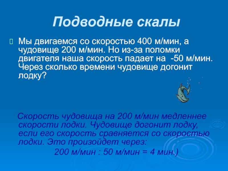 Скорость чудовища на 200 м/мин медленнее скорости лодки. Чудовище догонит лодку, если его скорость сравняется со скоростью лодки. Это произойдет через:
