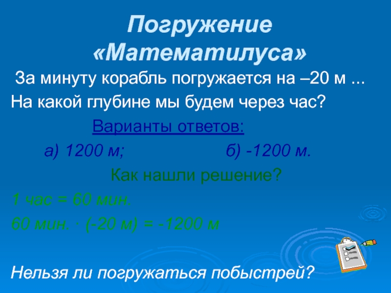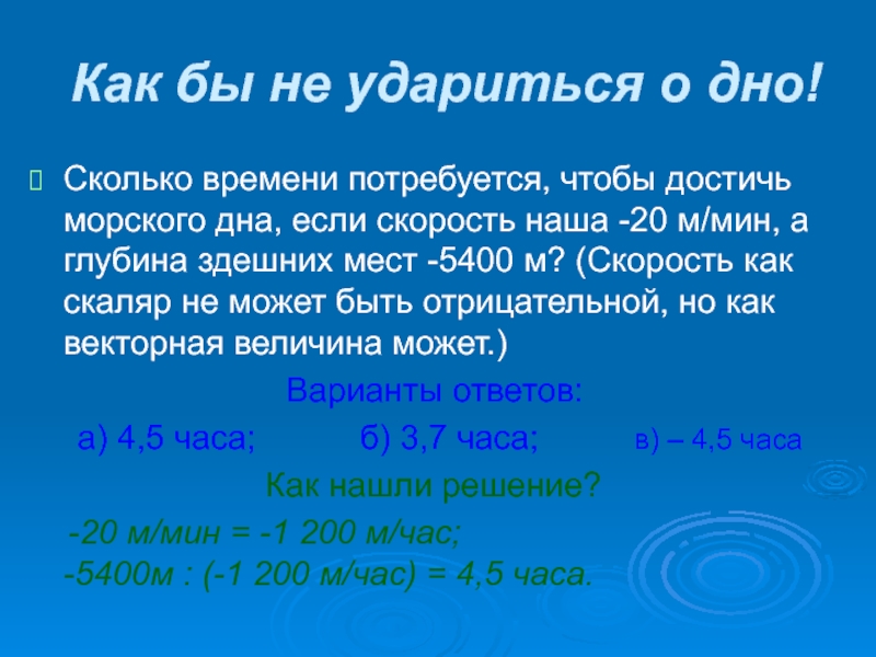 дна, если скорость наша -20 м/мин, а глубина здешних мест -5400 м? (Скорость как скаляр не может быть отрицательной, но как векторная величина может.)