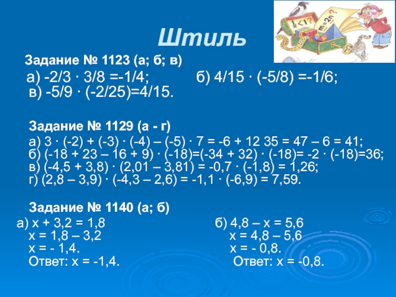6 = … г) -10 ∙ 11 = … б) 9 ∙ (-3) = … д) -1,45 ∙ 0 = … в) -8 ∙ (-7) = … е) 0,7 ∙ (-8) = …