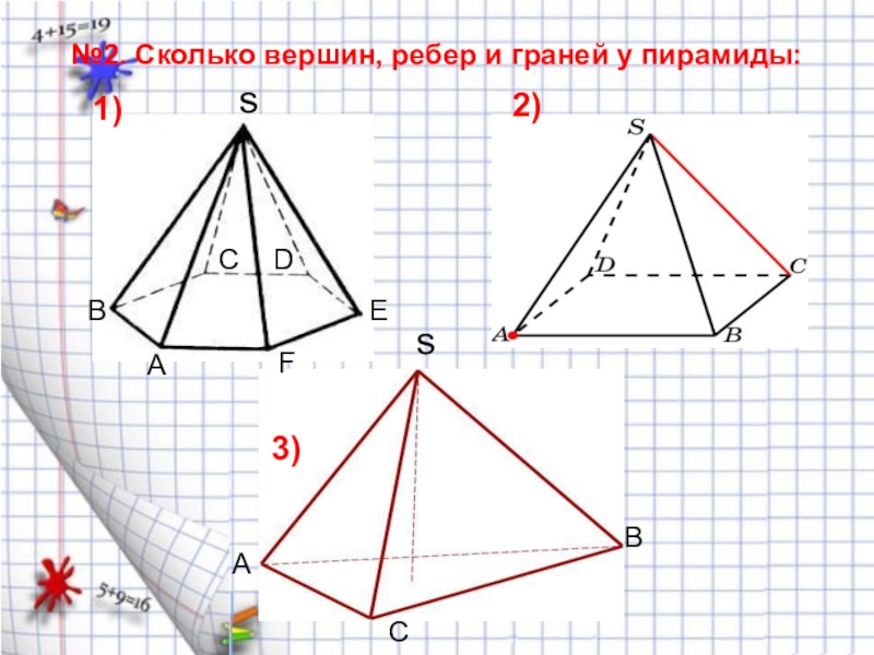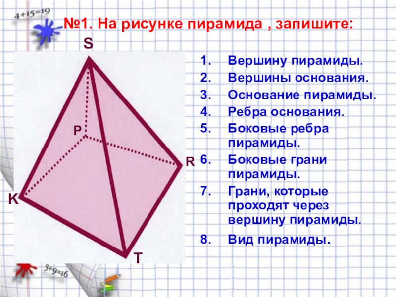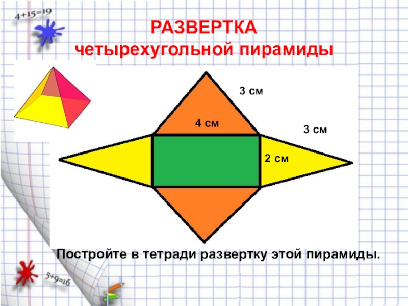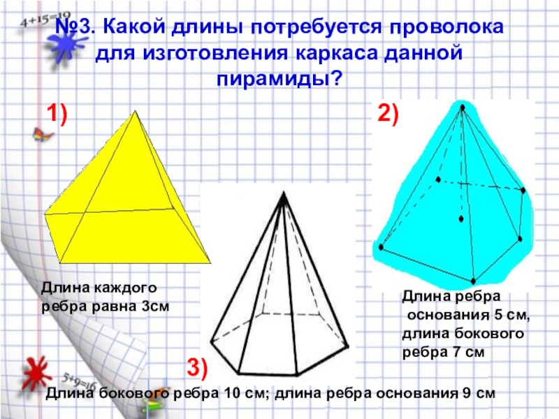 Длина бокового ребра 10 см; длина ребра основания 9 см