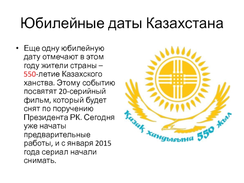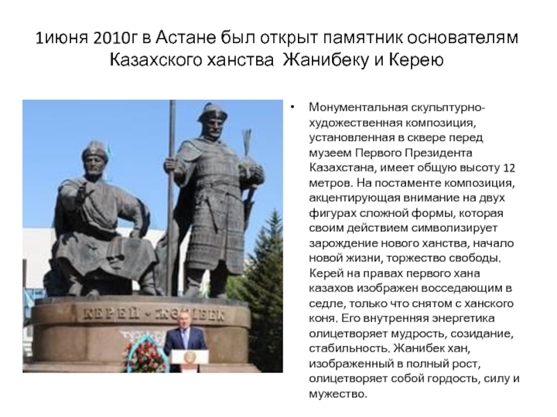 Монументальная скульптурно-художественная композиция, установленная в сквере перед музеем Первого Президента Казахстана, имеет общую высоту 12 метров. На постаменте композиция, акцентирующая внимание на двух фигурах сложной формы, которая своим действием символизирует зарождение нового ханства, начало новой жизни, торжество свободы. Керей на правах первого хана казахов изображен восседающим в седле, только что снятом с ханского коня. Его внутренняя энергетика олицетворяет мудрость, созидание, стабильность. Жанибек хан, изображенный в полный рост, олицетворяет собой гордость, силу и мужество.