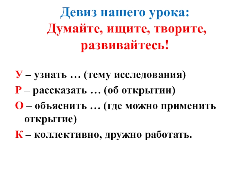 Девиз нашего урока:  Думайте, ищите, творите, развивайтесь! У – узнать … (тему исследования)Р – рассказать …
