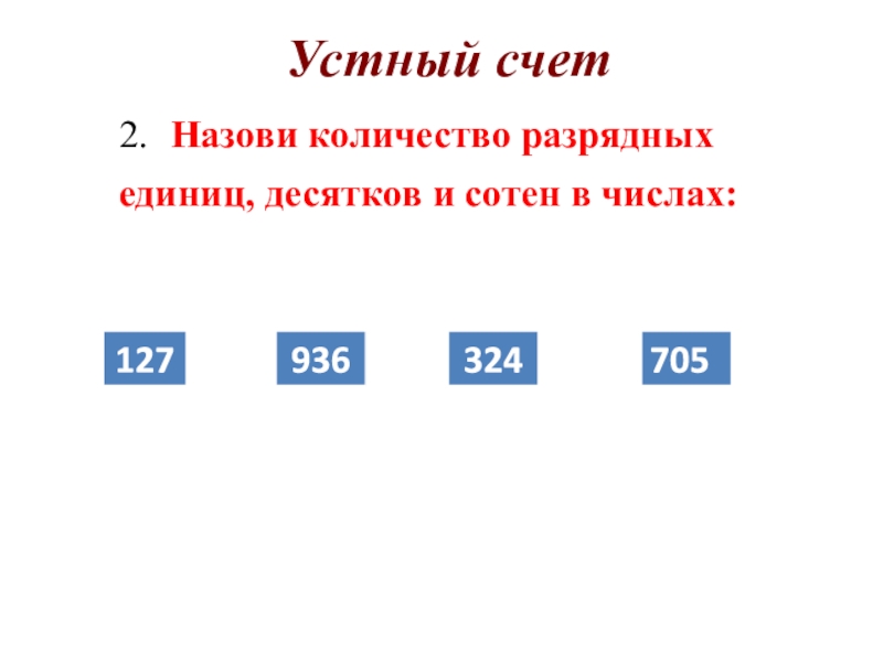 Устный счет2. Назови количество разрядных единиц, десятков и сотен в числах: