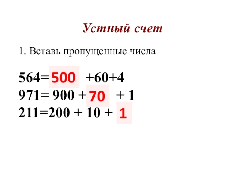 Устный счет1. Вставь пропущенные числа 564=  ?   +60+4	971= 900 +  ?  +