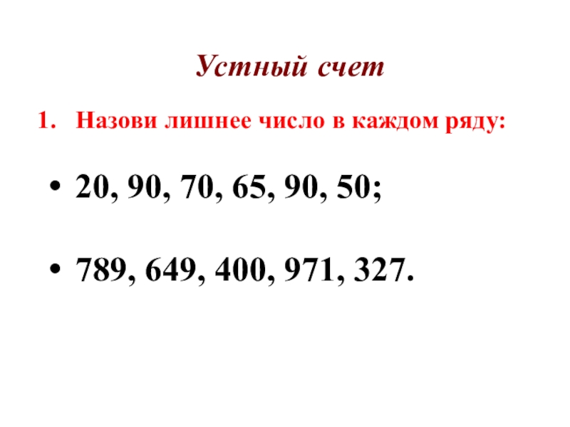 Устный счетНазови лишнее число в каждом ряду:20, 90, 70, 65, 90, 50;789, 649, 400, 971, 327.