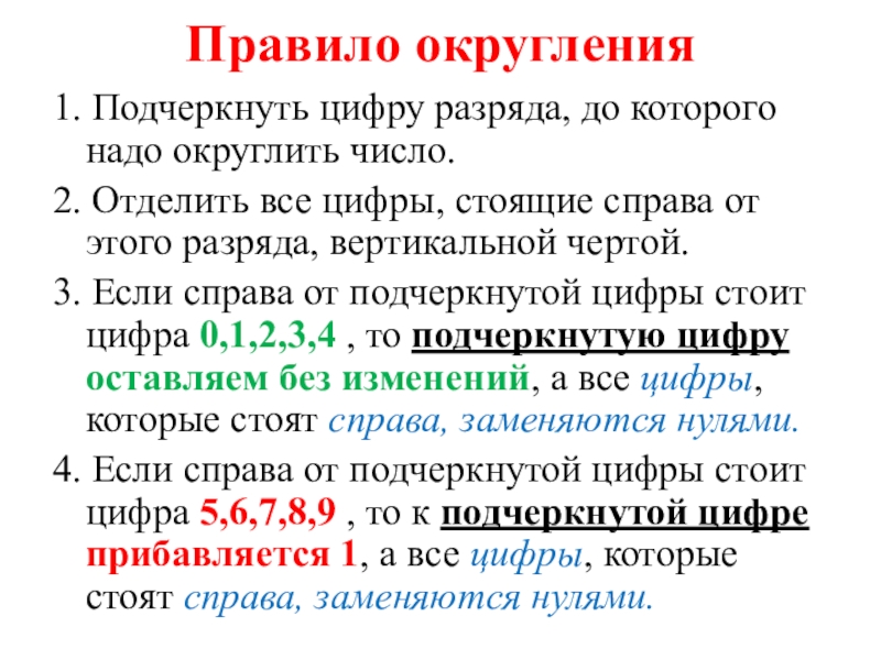 Правило округления1. Подчеркнуть цифру разряда, до которого надо округлить число.2. Отделить все цифры, стоящие справа от этого