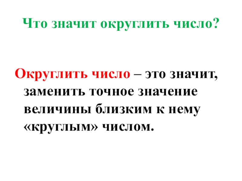 Что значит округлить число?Округлить число – это значит, заменить точное значение величины близким к нему «круглым» числом.