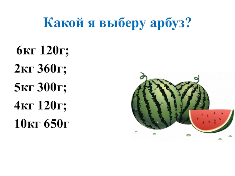 Какой я выберу арбуз? 6кг 120г; 2кг 360г; 5кг 300г; 4кг 120г; 10кг 650г