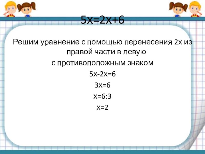 5x+ (-2x) = 2х+6+ (-2x)