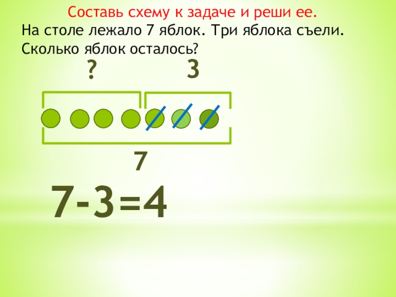 3?7-3=47     Составь схему к задаче и реши ее.На столе лежало 7 яблок. Три
