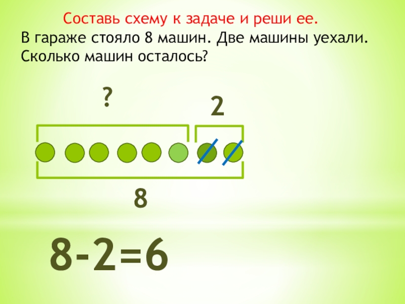 В гараже стояло 8 машин. Две машины уехали. Сколько машин осталось?