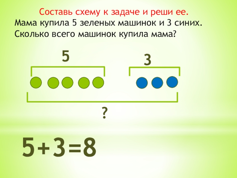 53?5+3=8 Составь схему к задаче и реши ее.Мама купила 5 зеленых машинок и 3 синих. Сколько всего машинок купила мама?