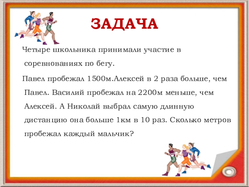 Павел пробежал 1500м.Алексей в 2 раза больше, чем Павел. Василий пробежал на 2200м меньше, чем Алексей. А Николай выбрал самую длинную дистанцию она больше 1км в 10 раз. Сколько метров пробежал каждый мальчик?