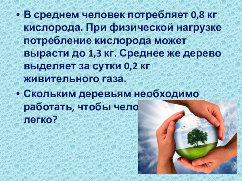 Слайд 28В среднем человек потребляет 0,8 кг кислорода. При физической нагрузке потребление