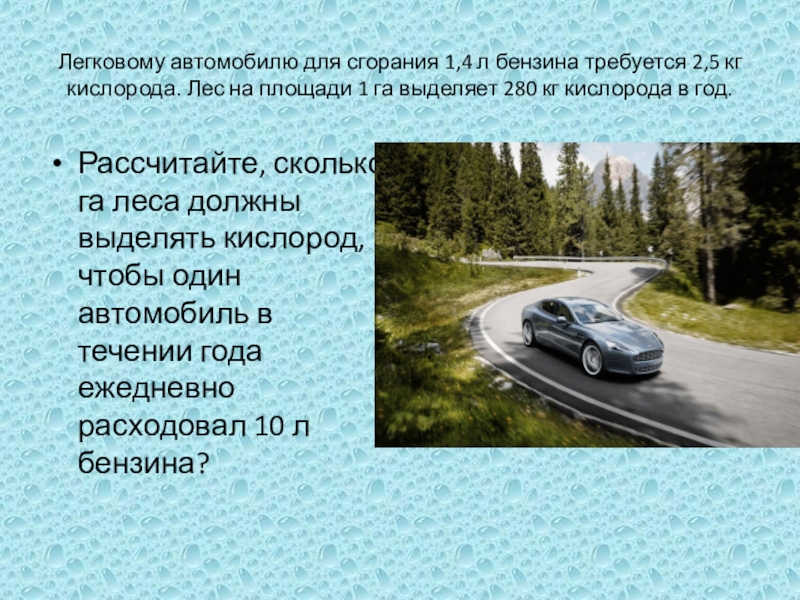 Слайд 53Легковому автомобилю для сгорания 1,4 л бензина требуется 2,5 кг кислорода.