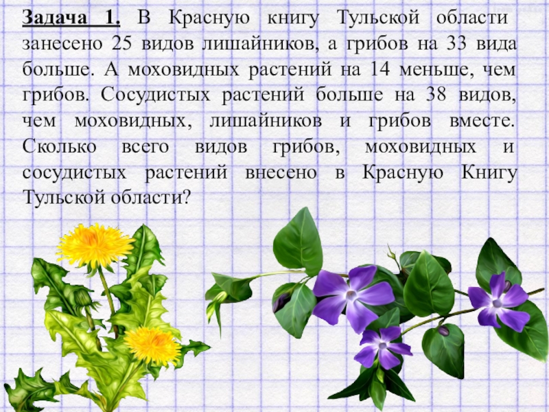 Слайд 32Задача 1. В Красную книгу Тульской области занесено 25 видов лишайников,