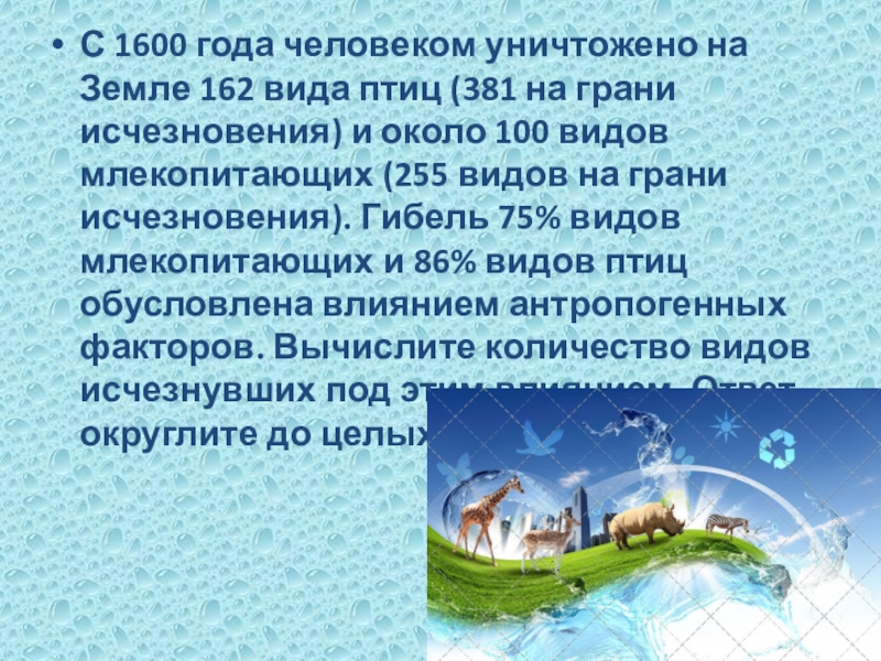 Слайд 42С 1600 года человеком уничтожено на Земле 162 вида птиц (381