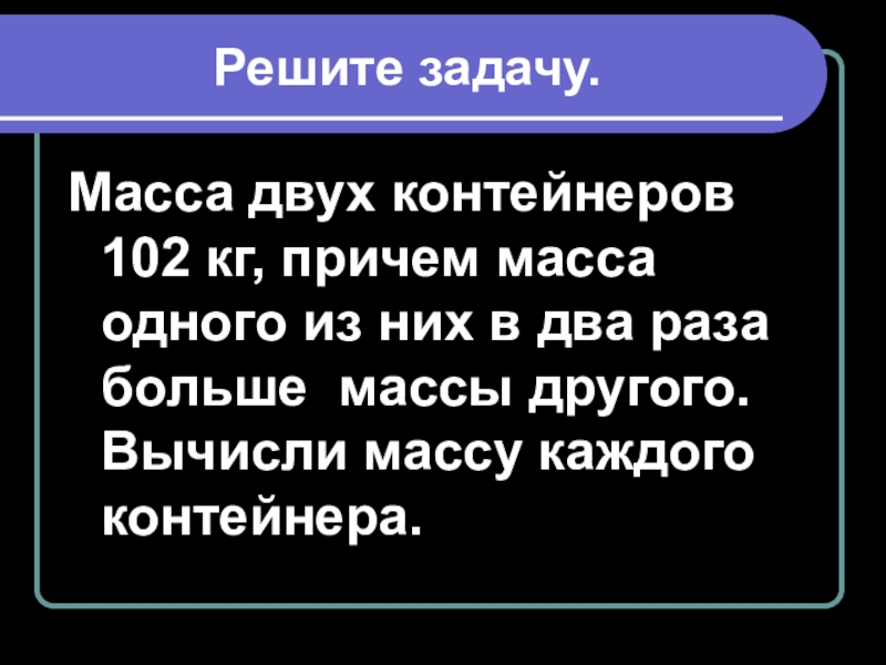 Решите задачу.Масса двух контейнеров 102 кг, причем масса одного из них в два раза больше массы другого.