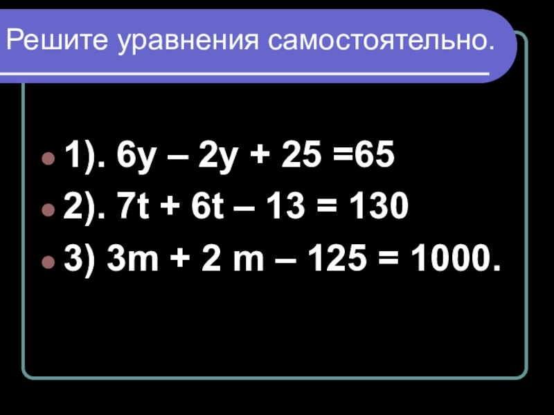Решите уравнения самостоятельно.  1). 6у – 2у + 25 =65 2). 7t + 6t – 13