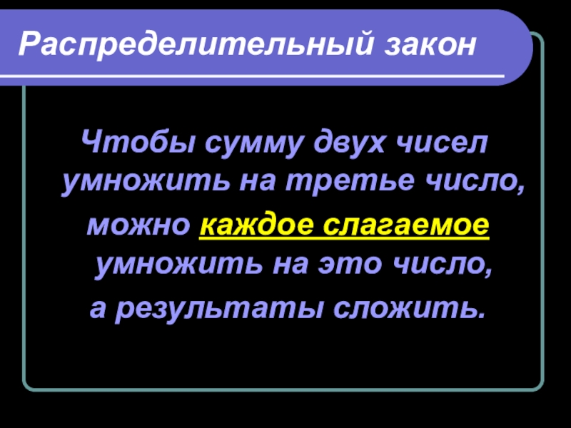 Распределительный законЧтобы сумму двух чисел умножить на третье число, можно каждое слагаемое умножить на это число, а