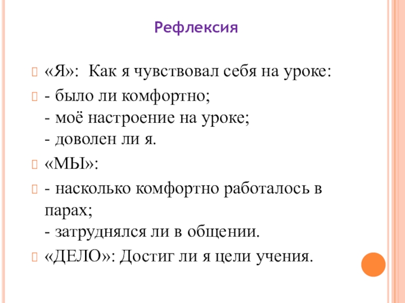 Рефлексия«Я»:  Как я чувствовал себя на уроке:- было ли комфортно; - моё настроение на уроке; -