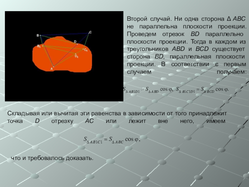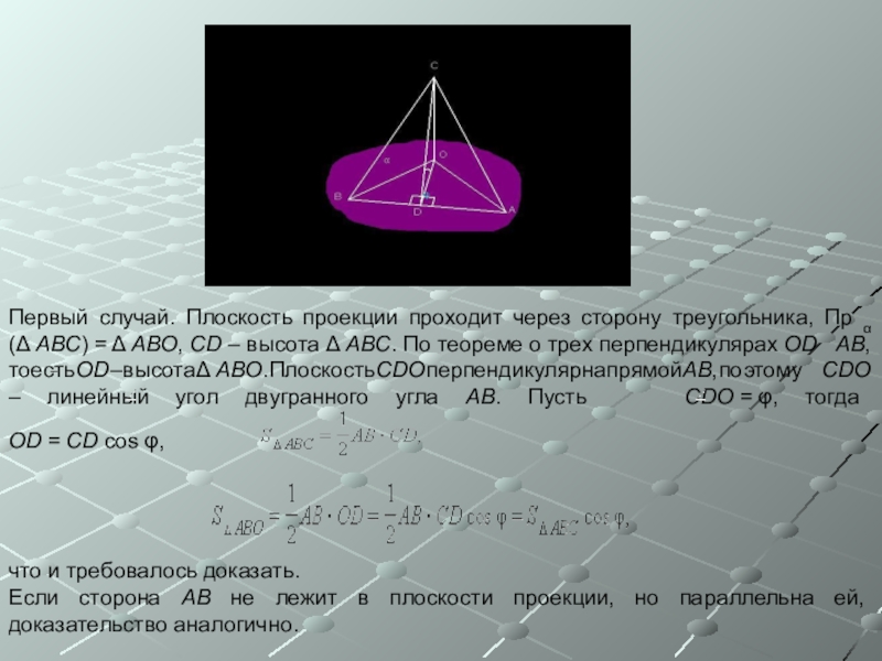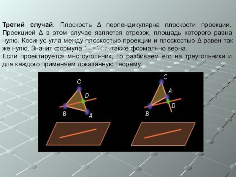 Площадь ортогональной проекции многоугольника на плоскость равна произведению его площади на косинус угла между плоскостью многоугольника и плоскостью проекции: