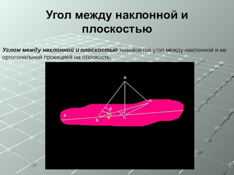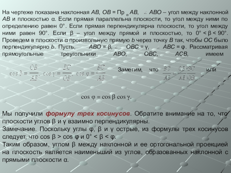 Таким образом, углом β между наклонной и ее ортогональной проекцией на плоскость является наименьший из углов, образованных наклонной с прямыми плоскости α.