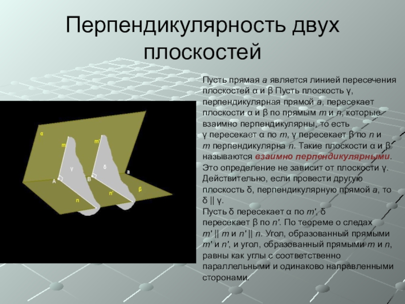Если плоскости α и β взаимно перпендикулярны, и к плоскости α проведен перпендикуляр, имеющий общую точку с плоскостью β, то этот перпендикуляр лежит в плоскости β.