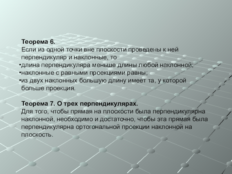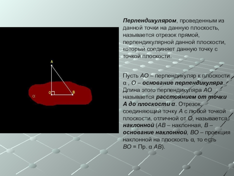 Пусть AO – перпендикуляр к плоскости α , O – основание перпендикуляра. Длина этого перпендикуляра AO называется расстоянием от точки A до плоскости α. Отрезок, соединяющий точку A с любой точкой плоскости, отличной от O, называется наклонной (AB – наклонная, B – основание наклонной, BO – проекция наклонной на плоскость α, то есть BO = Пр. α AB).