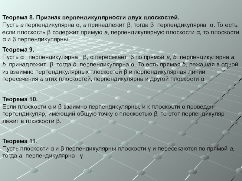 Пусть α перпендикулярна β, α пересекает β по прямой a, b перпендикулярна a, b принадлежит β, тогда b перпендикулярна α. То есть прямая b, лежащая в одной из взаимно перпендикулярных плоскостей β и перпендикулярная линии пересечения a этих плоскостей, перпендикулярна и другой плоскости α.