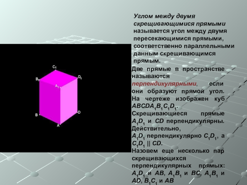 Две прямые в пространстве называются перпендикулярными, если они образуют прямой угол. На чертеже изображен куб ABCDA1B1C1D1. Скрещивающиеся прямые A1D1 и CD перпендикулярны. Действительно, A1D1 перпендикулярно C1D1, а C1D1 || CD.