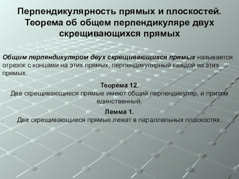 Две скрещивающиеся прямые имеют общий перпендикуляр, и притом единственный.