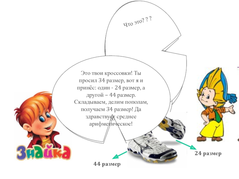 Это твои кроссовки! Ты просил 34 размер, вот я и принёс: один - 24 размер, а другой – 44 размер. Складываем, делим пополам, получаем 34 размер! Да здравствует среднее арифметическое!