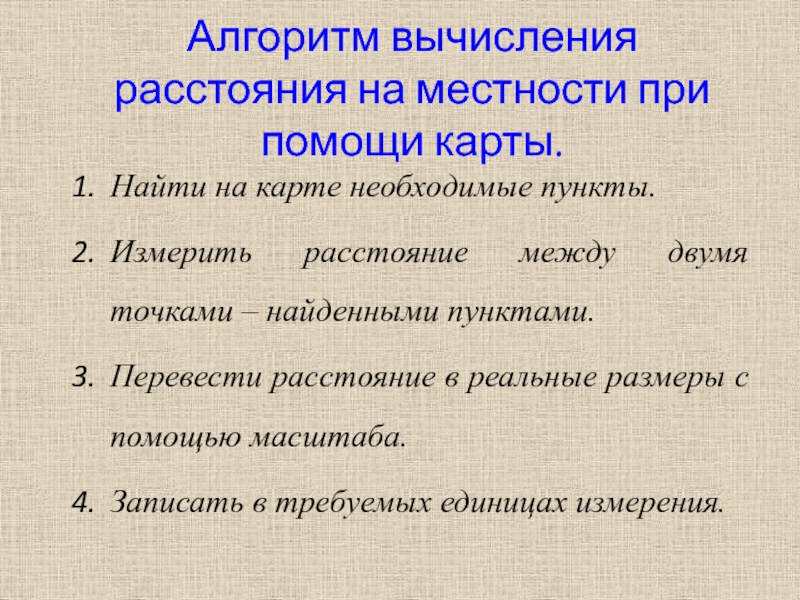 Алгоритм вычисления расстояния на местности при помощи карты.